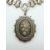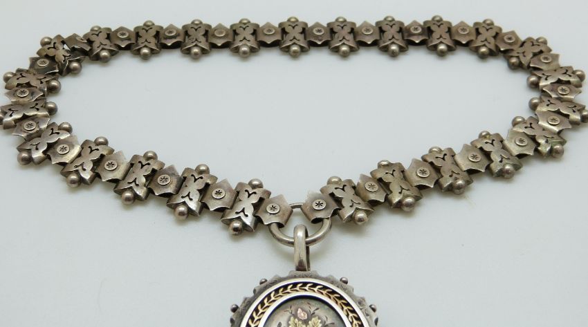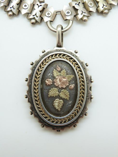 A Victorian silver locket decorated with applied floral and foliate gold decoration on a Victorian silver pierced necklace