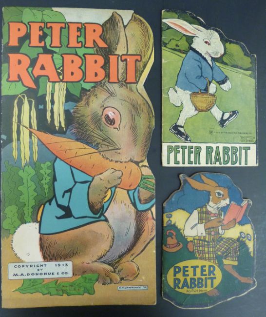 [Shaped Books] Peter Rabbit illustrated by C.H. Lawrence 1913 shaped around foredge, Peter Rabbit 1916 with colour covers by Albert and another die-cut edition by Goldsmith (3)