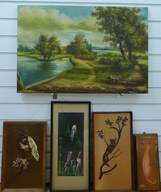 Watercolour of birds by E Ngoma, signed copper pictures including G Gwatiozo and Roy Sinclair and an oil landscape