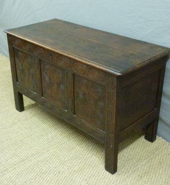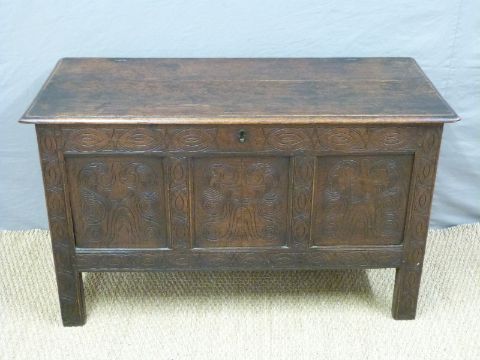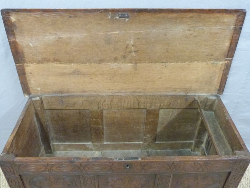 An 18thC four-panel carved oak chest or coffer, H74 x W138 x D52cm