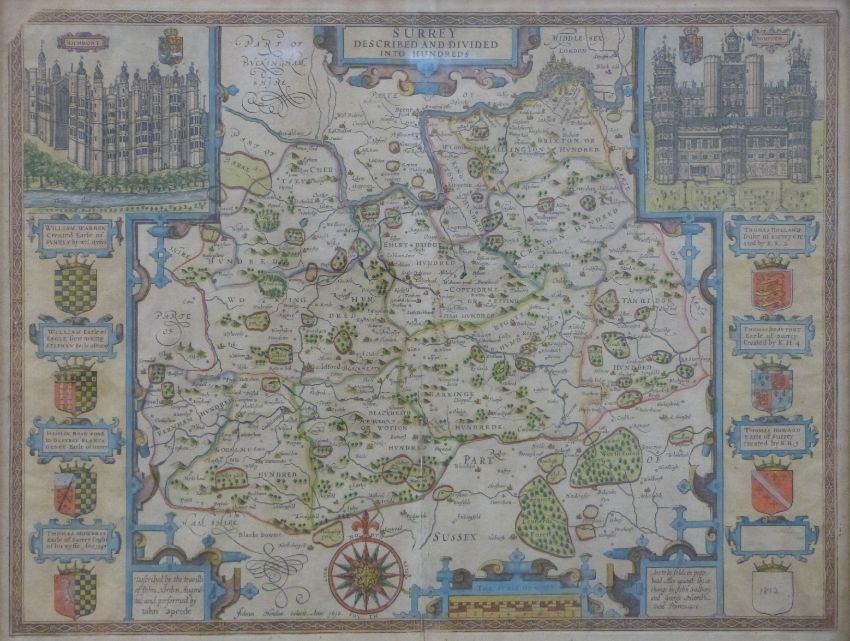A framed 17thC John Speede hand coloured map of Surrey, with inset panels of Richmont and Nonsuch Palaces together with Arms of various Earls of the County, with later additional colouring, 45 x 53cm
