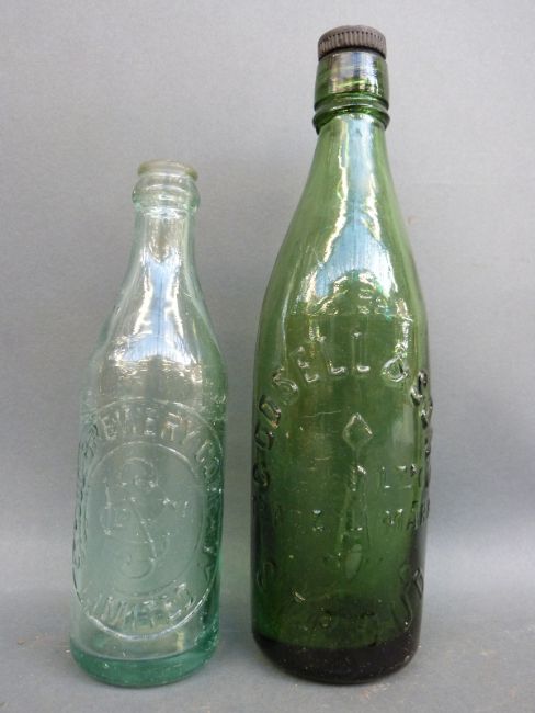 A collection of old beer bottles of Stroud interest and assorted ceramic pot lids