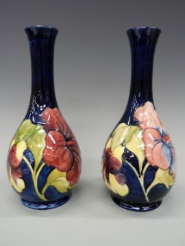 A pair of Moorcroft pedestal vases in the Hibiscus pattern, height 27cm