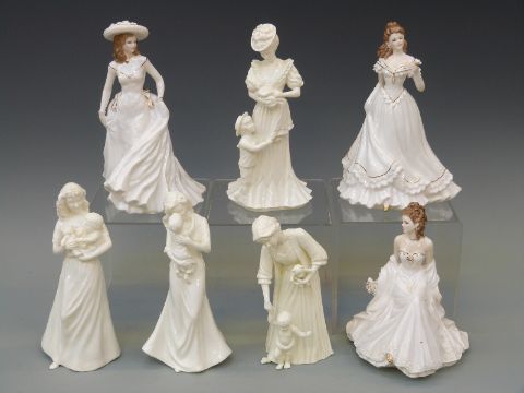 Seven Royal Worcester figurines including three from the Golden Moments Series and the First Kiss, First Steps, Christening etc, tallest 22cm