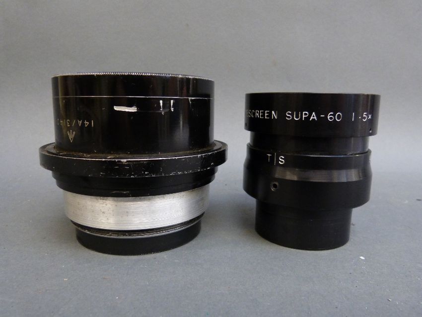 A 14A/3140 14inch F5.6 arial photography or similar lens and a Widescreen Supa-60 1.5x lens