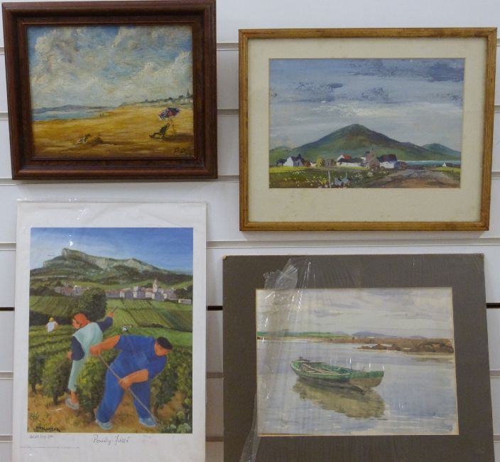 M M Loxford signed limited edition (390/1250) print 'Pouilly-Fuisse' together with a framed watercolour possibly Scottish, an oil on canvas 'Beach at Exmouth' and a watercolour of a boat