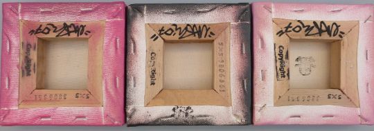 Copyright, three mixed media oil on canvas 'Glamour' with certificate from Orpus Underground, each 12.5 x 12.5cm