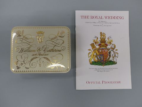 A piece of William & Catherine 29 April 2011 wedding cake, in tin with presentation card numbered 500040 and in cardboard box named Mr Dennis Brown, RVM, who was a gardener at Highgrove, together with an official programme for the wedding