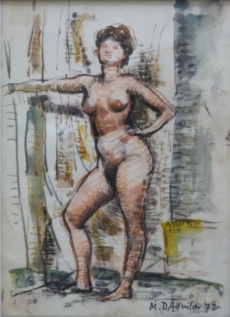 Michael D'Aguilar (1924-2011) charcoal and coloured chalk on paper nude, signed and dated 72 lower right, 24 x 17cm