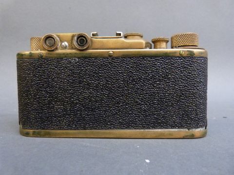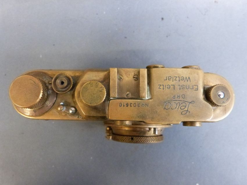 A FED or Zorki Leica copy camera, in brass finish bearing serial number 303610, in case, also marked Leica