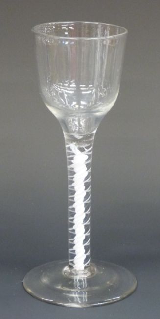 An 18thC cotton twist cordial glass with ogee bowl, multi-spiral stem and stepped foot, 15.5cm tall.