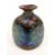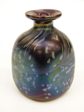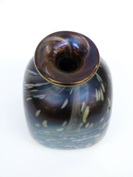 Isle of Wight blue iridescent glass bud vase of square form with collared neck and speckled and trailed decoration, 8cm tall.