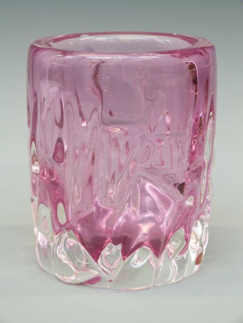 Pavel Hlava for Novy Bor Czechoslovakian pink Art Glass Cage vase (16.5cm tall) and a Skrdlovice amber glass bowl (21cm in diameter).