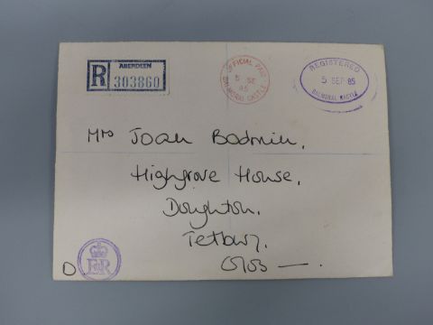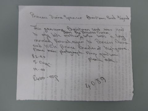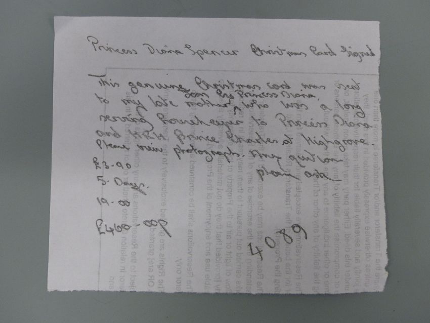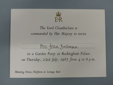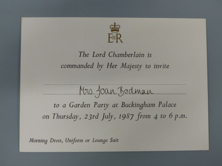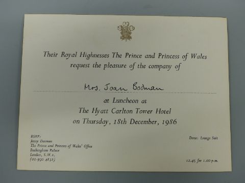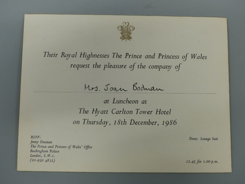A Princess Diana hand signed and written letter to Joan Bodman, dated September 3rd 1985, saying that even though they were in Scotland they were thinking of how Joan's operation went and how she wasn't rushing around Highgrove. On Balmoral Castle headed paper and addressed to Mrs Joan Bodmin, Highgrove House, together with two invitations to Mrs Joan Bodman, one dated 1986 the other 1987 and a hand written note saying that 'my late mother Joan ... was a long serving housekeeper to Princess Diana and HRH Prince Charles at Highgrove'