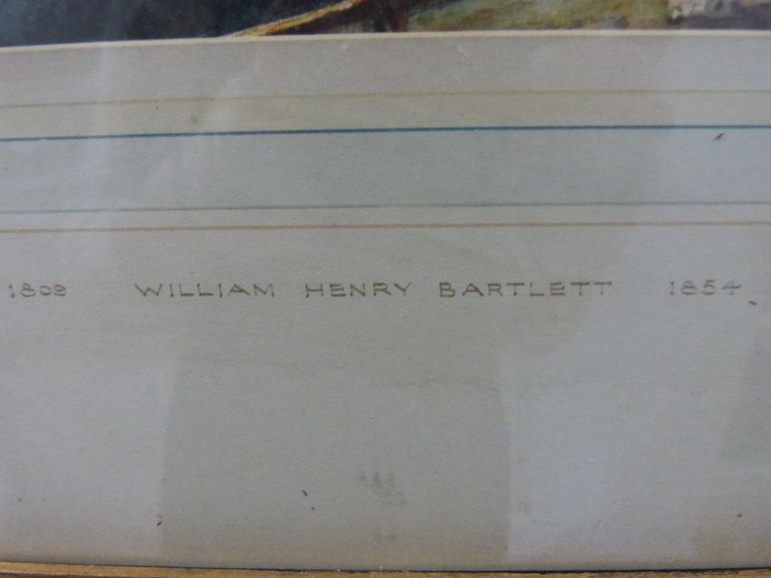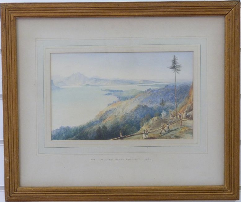 Attributed to William Henry Bartlett (1809-1854) watercolour extensive continental coastal landscape with figures on a terrace, 18 x 30cm, named to mount