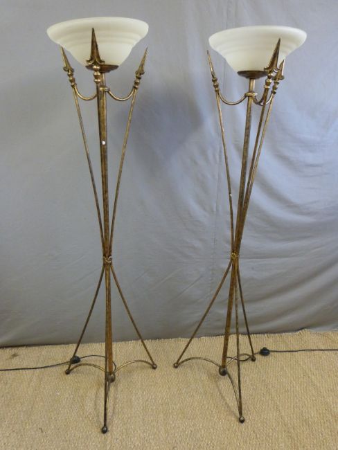 A pair of modern designer gilt metal and glass standard or uplighter lamps, H183cm