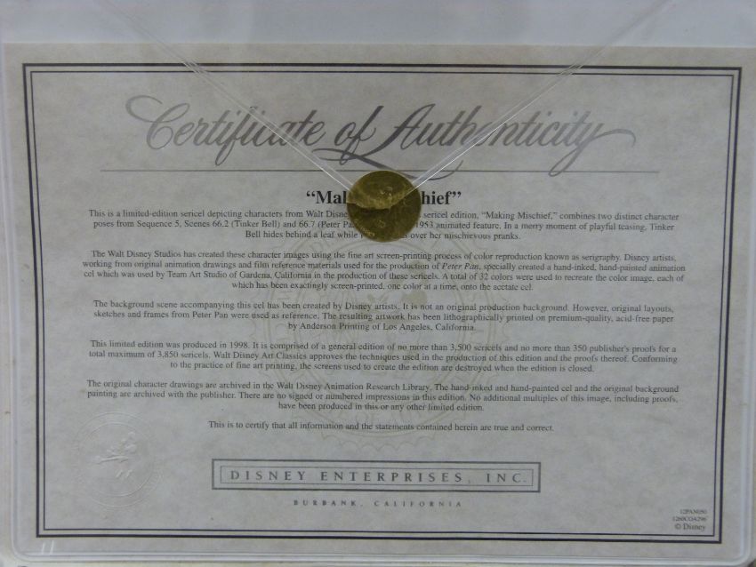 Walt Disney sericel 'Making Mischief' depicting Peter Pan and Tinkerbell, limited edition of 3500, with certificate of authenticity, 34 x 25cm.
