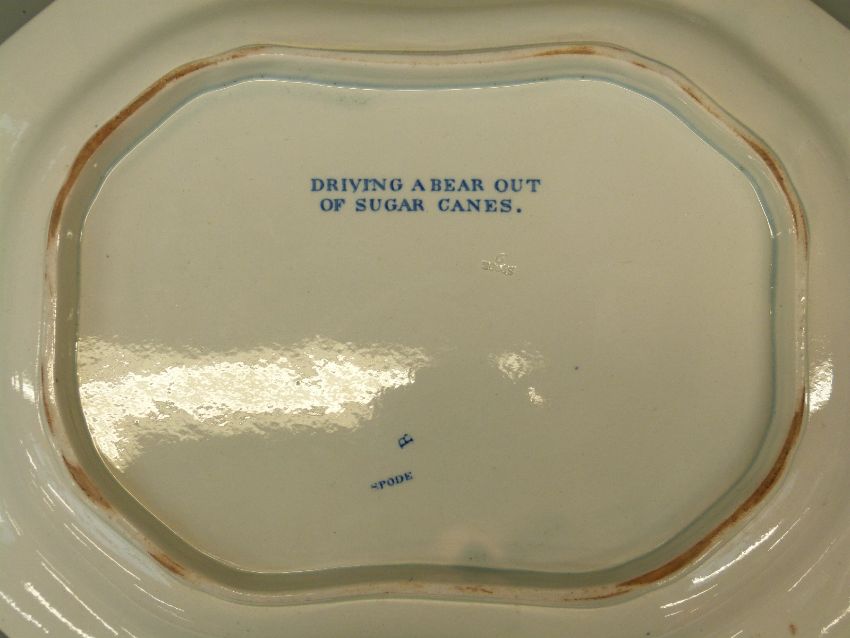 A Spode Indian Sporting Scenes meat plate with underglaze blue script verso 'Driving a Bear out of Sugar Canes' 40 x 33cm