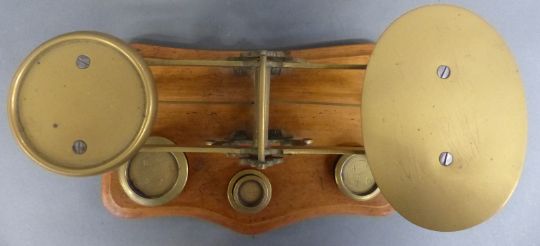 A set of Drake, Driver & Leaver of London postal scales, with weights, length 28cm