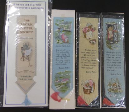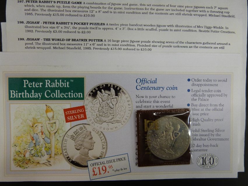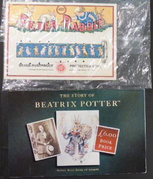[Beatrix Potter] Early nursery cutlery with images of Peter Rabbit, solid sterling silver Peter Rabbit centenary coin issued by the Gibraltar Government, silk bookmarks with Potter & other stamps & covers