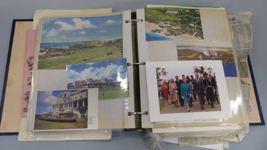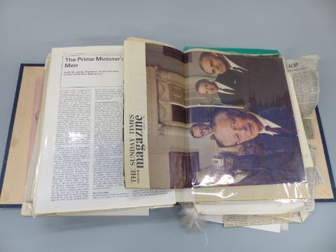 A comprehensive scrapbook of political and Royal interest accumulated by Jane Parsons OBE who worked for many Prime Ministers and Royal households.The album contains possibly unpublished photographs of people and places including interiors of various buildings, Balmoral Castle, Harold Macmillan in Bermuda, letter from Downing Street offering OBE, Union Castle Line menu, pictures of aircraft, official pass and ephemera regarding United Kingdom delegation Prime Minister's visit to Moscow February 1959 including menus, many newspaper/magazine clippings, signed Harold Macmillan letters to Jane Parsons on Prime Minister headed paper and another on American Embassy headed paper. A further eight letters signed by Harold Macmillan to Jane Parsons showing they were on very good terms, including information on a party at her house, thank you notes and invitations, memorial items, signed Clementine Churchill letter on headed Chartwell paper expressing sympathy at the loss of her mother at such a young age, signed Margaret Thatcher letter thanking her for her support at a difficult period dated 1984, signed Alec Home letter, invitation and menu to the 50th anniversary of Winston Churchill's appointment as Prime Minister at 10 Downing Street, a collection of handwritten letters and clippings regarding various political figures, obituaries, lecture cards, lots of congratulatory letters regarding Jane Parsons OBE including Chief Whip and other political notables (Jane Parsons collection)