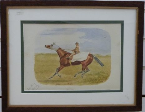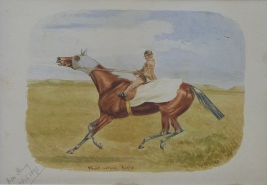 Watercolour "Might versus Right", horse racing interest, initialled and dated IDH 1891 lower right and dated Oct 16 1891 in pencil lower left 'from Henry', 22 x 32cm