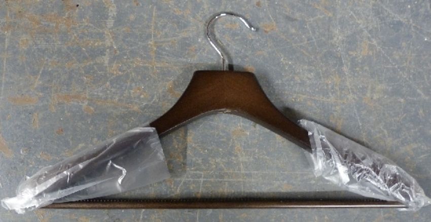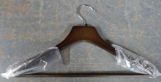 Approximately 70 quality walnut finish clothes hangers (new in boxes) with anti slip shoulder and trouser feature
