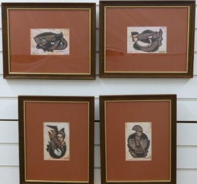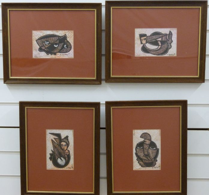 Four abstract African pen and ink pictures, indistinctly signed possibly S Ogunbayo