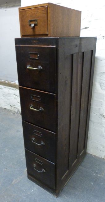 A vintage oak four drawer filing cabinet and a further small single drawer, largest H137 x W37 x D65cm