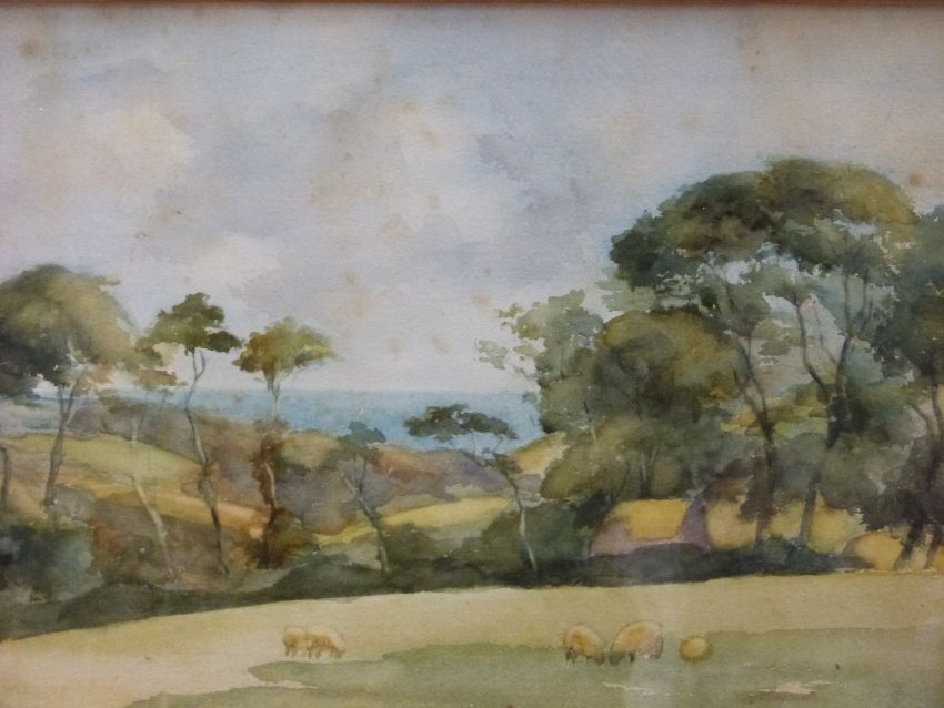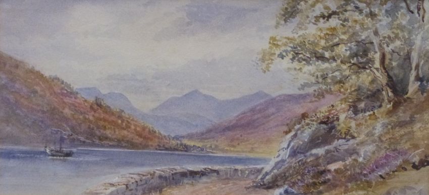 Agnes Dundars watercolour Loch Arking, 16 x 34cm, Grace Bassett watercolour harbour scene and Kerkin Broad watercolour landscape