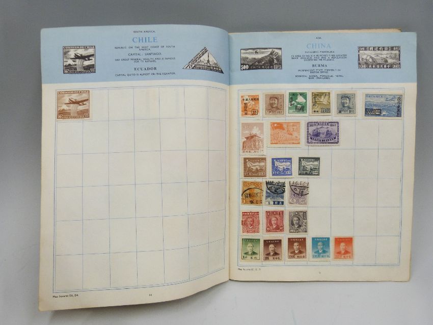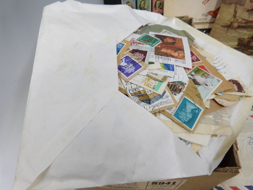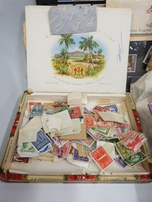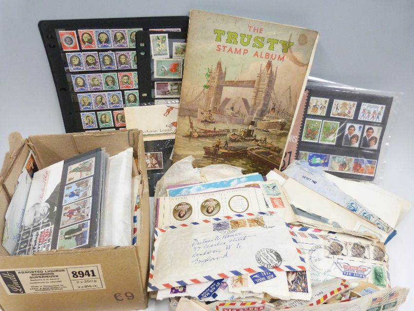 A box of loose stamps, a Trusty stamp album, presentation packs and a small quantity of lead soldiers