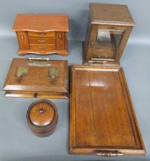 An oak smoker's cabinet with fitted interior, oak standish with drawer, tray and a jewellery cabinet