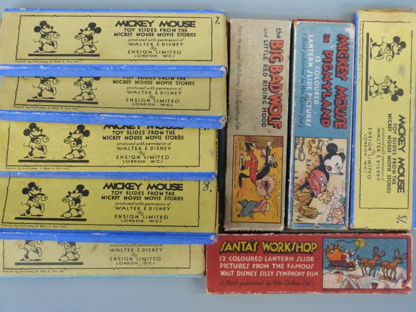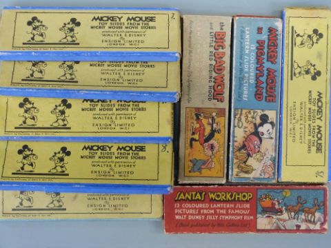 A quantity of Mickey Mouse and other Disney toy slides together with a quantity of educational slides including physics etc
