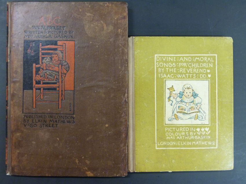 Mrs. Arthur Gaskin ABC an Alphabet published Elkin Mathews 1896 with a copy of Divine and Moral Songs for Children by the Reverend Isaac Watts, pictured in colour, Elkin Mathews (c1896) both volumes in original pictorial bindings