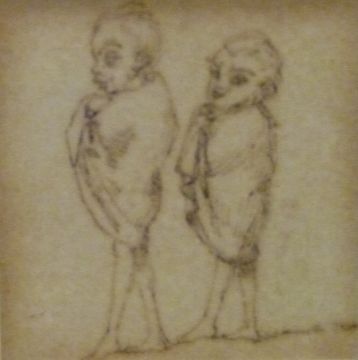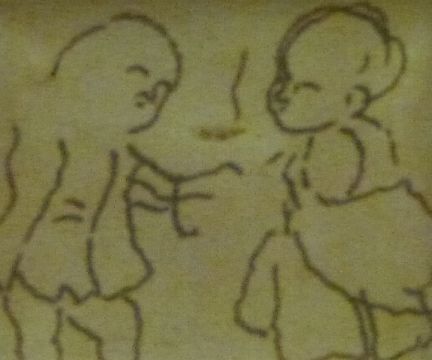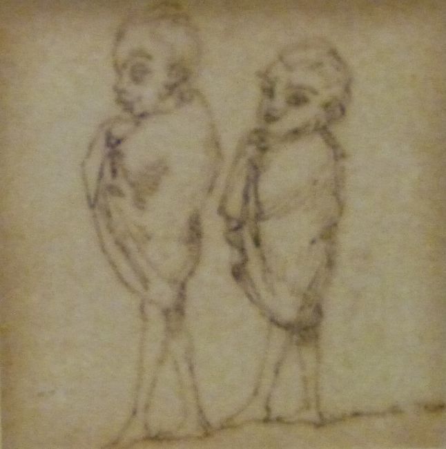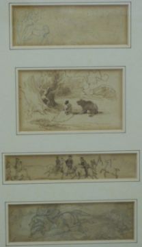 A set of four pen and ink drawings including figures on horseback and people with bears (framed as one) and four similar drawings including a parrot, largest of drawings 7.5 x 13cm