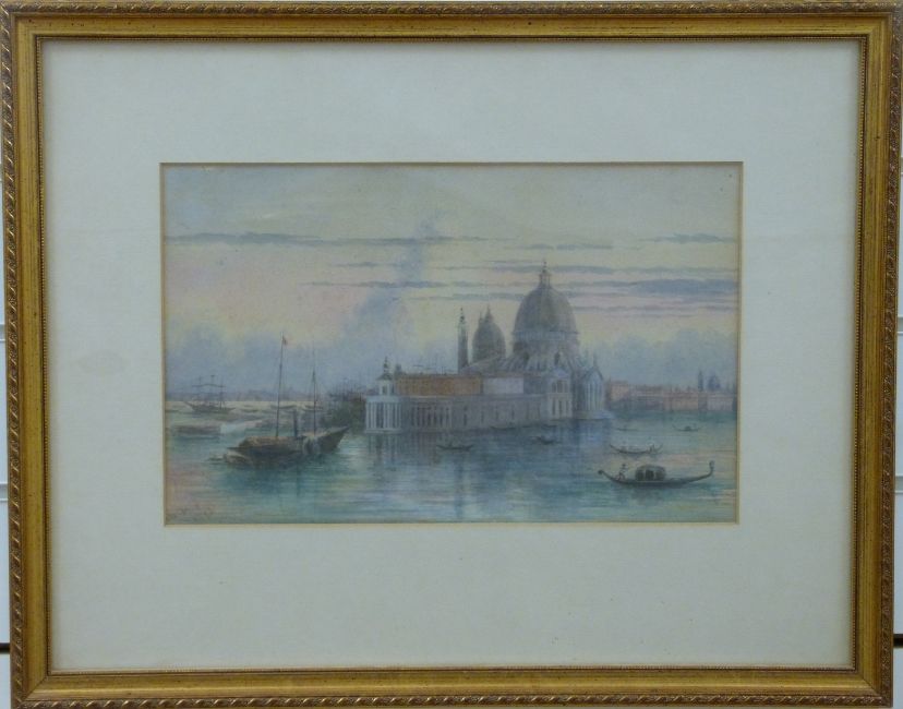 A 19thC watercolour of Venice waterfront with paddle steamer, gondolas etc, monogrammed possibly M H P and dated 1813, 22cm x 34cm