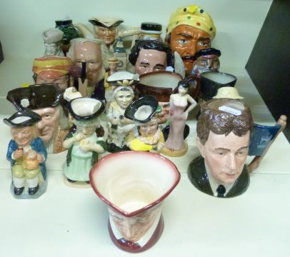 A large collection of Royal Doulton and other small character jugs including signed Michael Doulton, Cardinal, W G Grace, Christopher Columbus, Charles Dickens and Kevin Francis miniature toby jugs