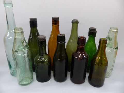 A collection of vintage ginger beer and other bottles including Stroud, Chalford, Bristol and Douglas, Isle of Man etc