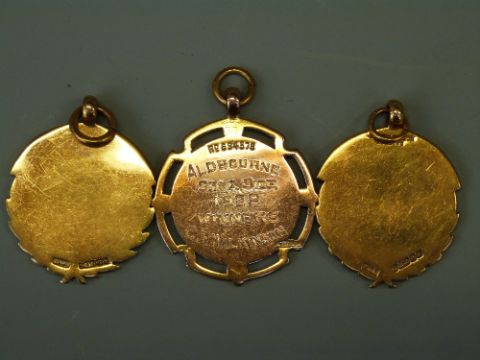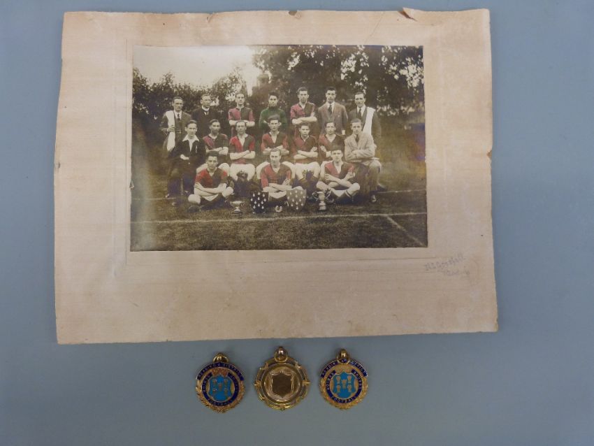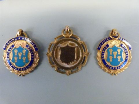 Three Reading and District Senior Football League 9ct gold fobs / medals, one engraved Aldbourne Six-a-Side 1928 winners together with photo
