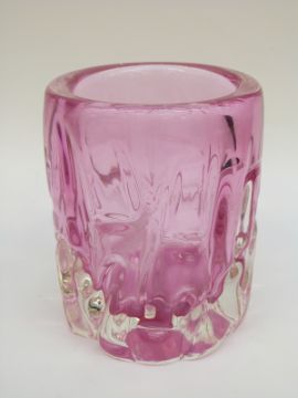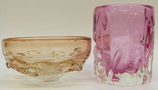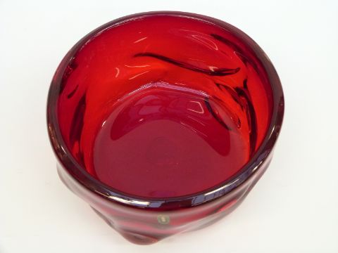 Whitefriars Knobbly ruby glass fruit bowl with original label, 22cm in diameter.