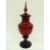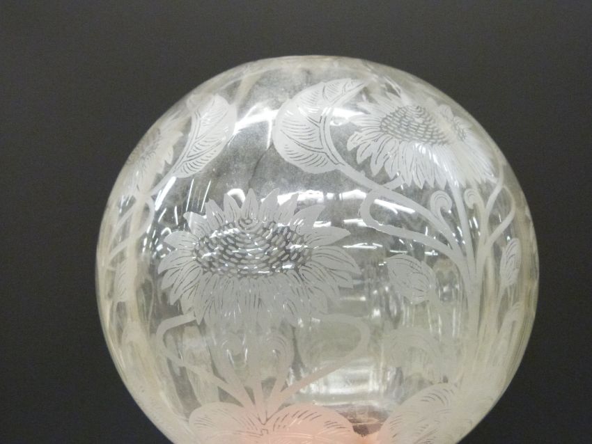 Four pieces of decorative glassware comprising a Victorian etched glass globular lamp shade with sunflower decoration, large ruby glass urn (48cm tall), cranberry flash overlaid cut galss decanter and Czech Art Deco powder bowl.