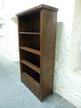 An Indonesian hardwood bookcase of three shelves over two drawers, approximately H94 x W106 x D41cm