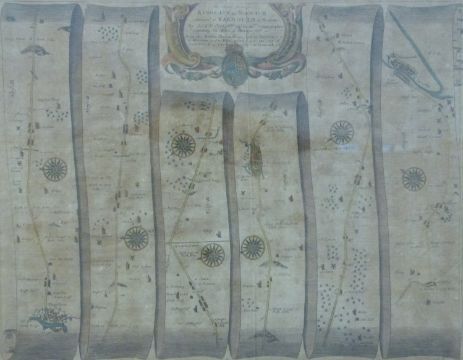 A framed 17thC hand coloured strip road map by John Ogilby (1600-1676), The Road from Kings - Lyn to Norwich continued to Yarmouth in Norfolk, approximately 44.5cm x 35cm