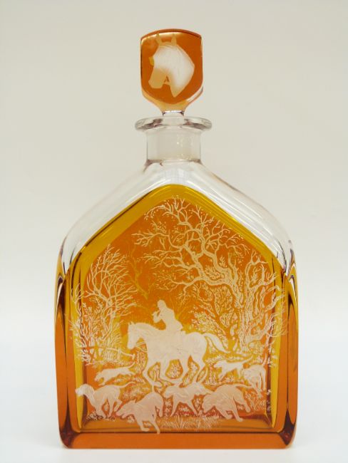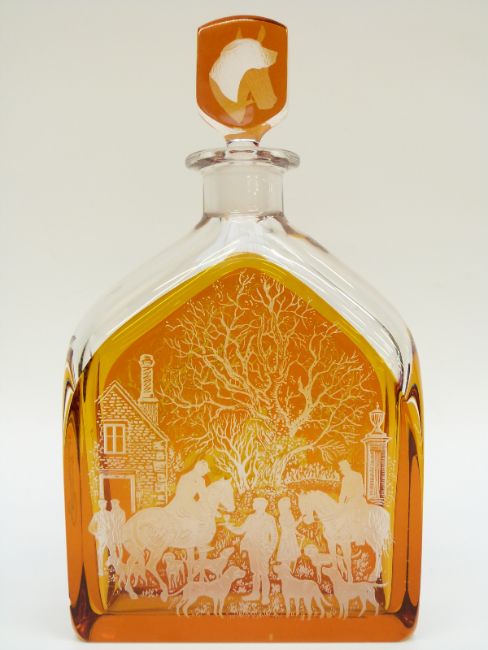 Orrefors clear and amber glass flash overlaid decanter etched with hunting scenes, a horse's head to the stopper and hound head verso, signed Zaglo and numbered H2495/28 Zaglo H101/102A UK No. 039 to the base, 27.5cm tall.