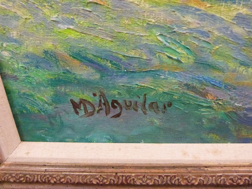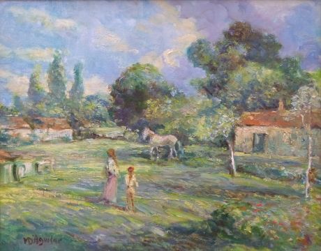 Michael D'Aguilar (1924-2011) acrylic on canvas two figures watching a horse with buildings beyond, signed lower left and dated 1978 and titled 'Le Cheval Blanc, Fressingfield, Suffolk' in ornate frame, 60 x 75cm