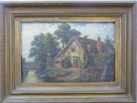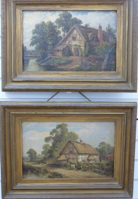 T.Thomas 19thC pair of oils on canvas of thatched cottages, both on lanes beside stream, one with cattle grazing and pencil inscription verso 'Lane near Maxstoke', 28 x 44cm