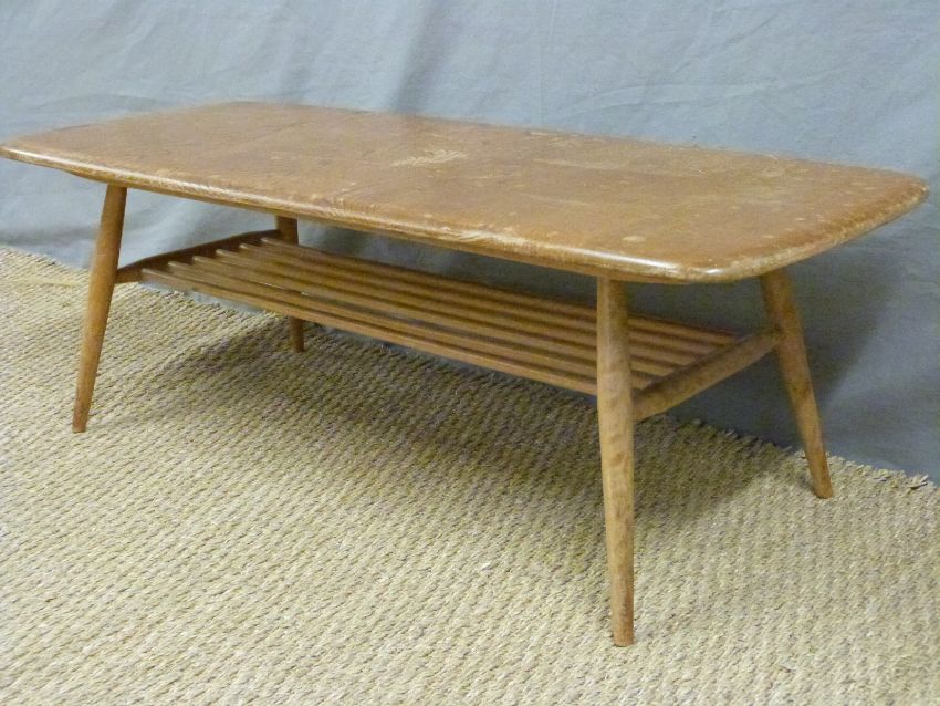 A light elm Ercol coffee table with stick style undershelf, H39 x W106 x D45cm