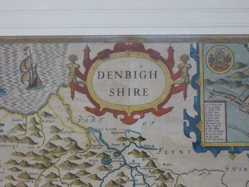 A 17th century John Speed hand-tinted map of Denbighshire with town plan of Denbigh, c1610, 38cm x 50cm