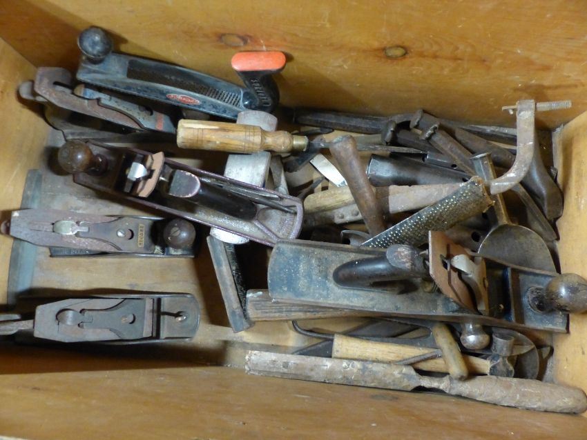 A 19th/20thC stained pine chest with interior tray containing woodworking planes by Stanley (no 4), Record No 03, Roebuck no 5, unmarked planes, large Record wrenches, Little Giant, Stillson etc, chest measures H42 x W79 x D46cm
