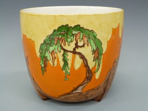 Wilkinson Pottery Art Deco jardiniere in the Clarice Cliff style, stamped Memory Lane to base, 16.5cm tall, 19.5cm diameter